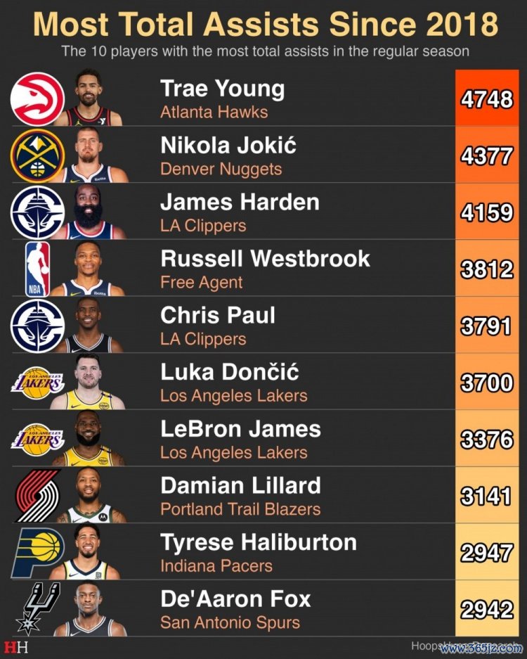 9月27日讯 美媒HoopsHype统计,从2018年至今NBA助功 最多的10位球员,网球新闻直播吧其中特雷-杨最多有4748次, 篮球新闻资讯而约基奇排名第二有4377次。