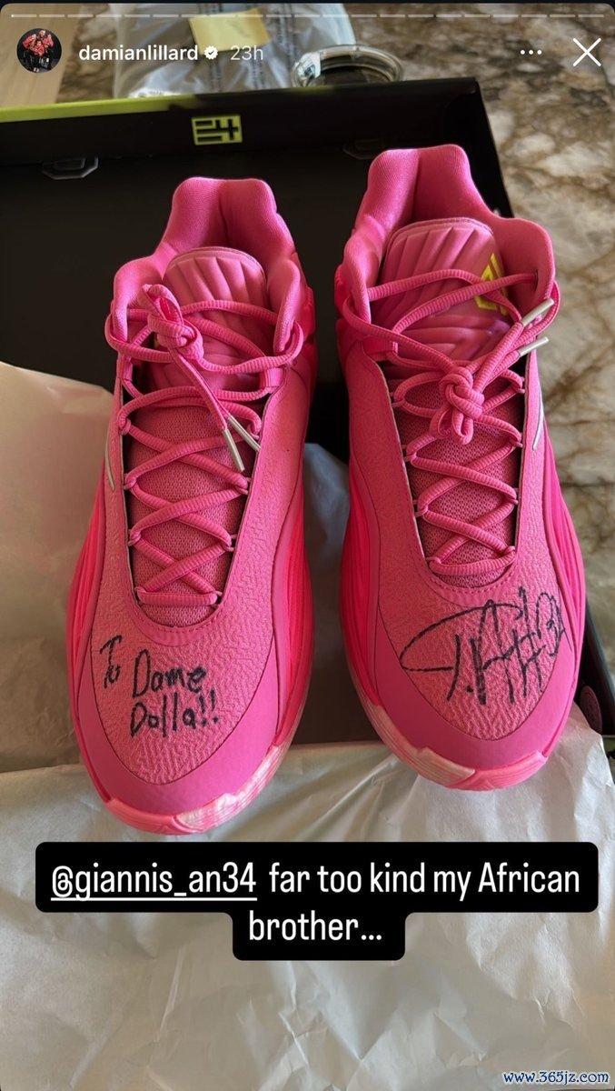 10月15日讯 利拉德在个人社媒晒出了字母哥给他送来的运动活动 鞋 礼物,利拉德写道:“@字母哥,太够意思,我的非洲兄弟。”