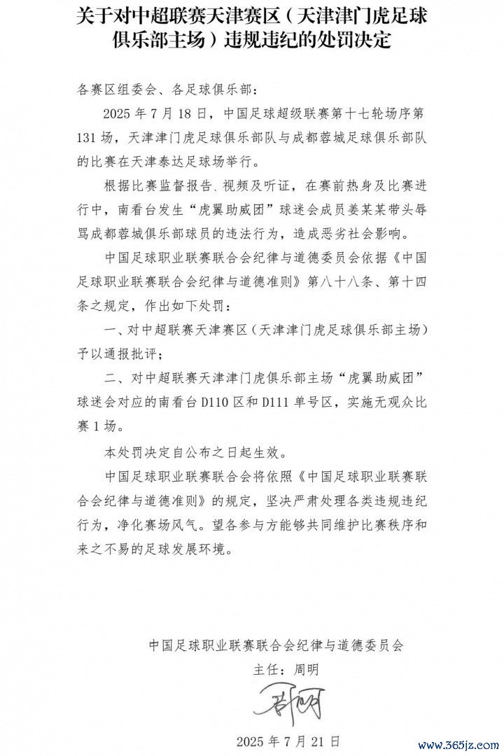 近日,在2025华润饮料中超职业联赛 第17轮天津津门虎对阵成都蓉城的赛事 中,出现个别球迷对球员的侮辱谩骂行为,严重违背运动精神 ,网球新闻破坏职业联赛 秩序, 篮球新闻资讯造成恶劣的社会影响。