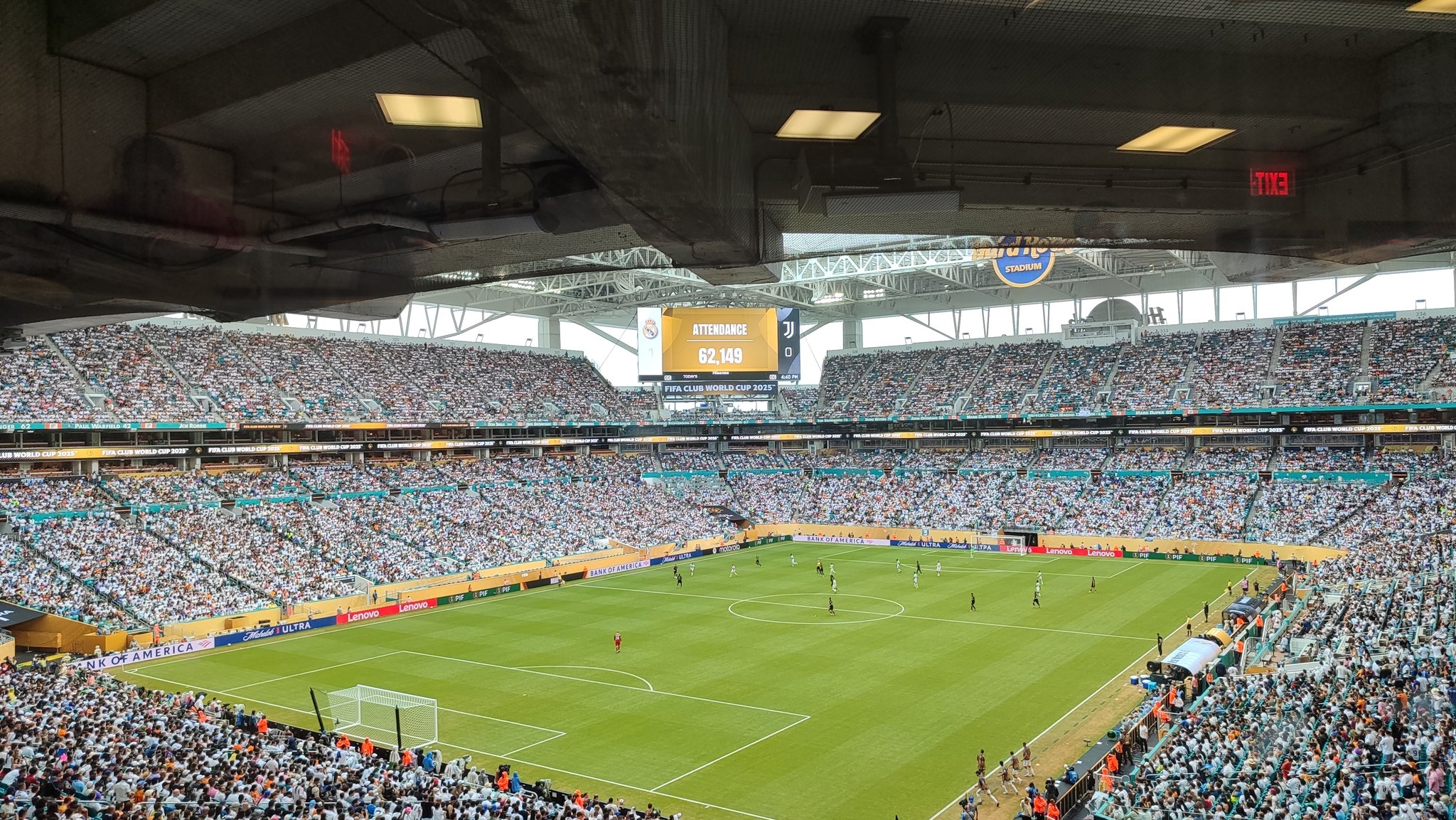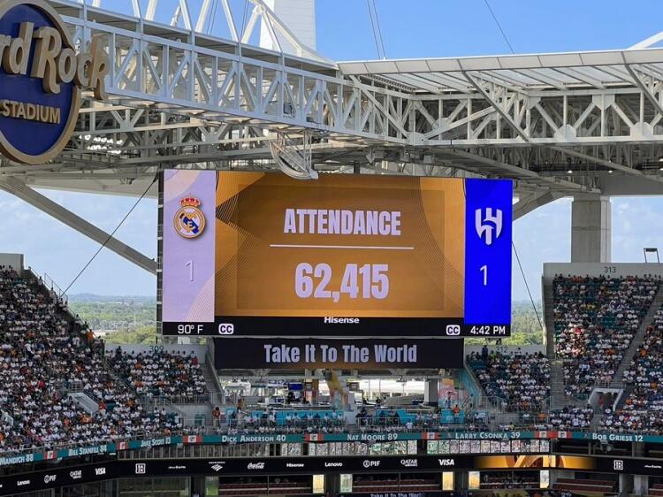 世俱杯1/8总决赛 ,皇马在硬石运动场 1-0尤文,现场观赛人群 为62149人,运动活动 场 容量为65000人,上座率95.61%。