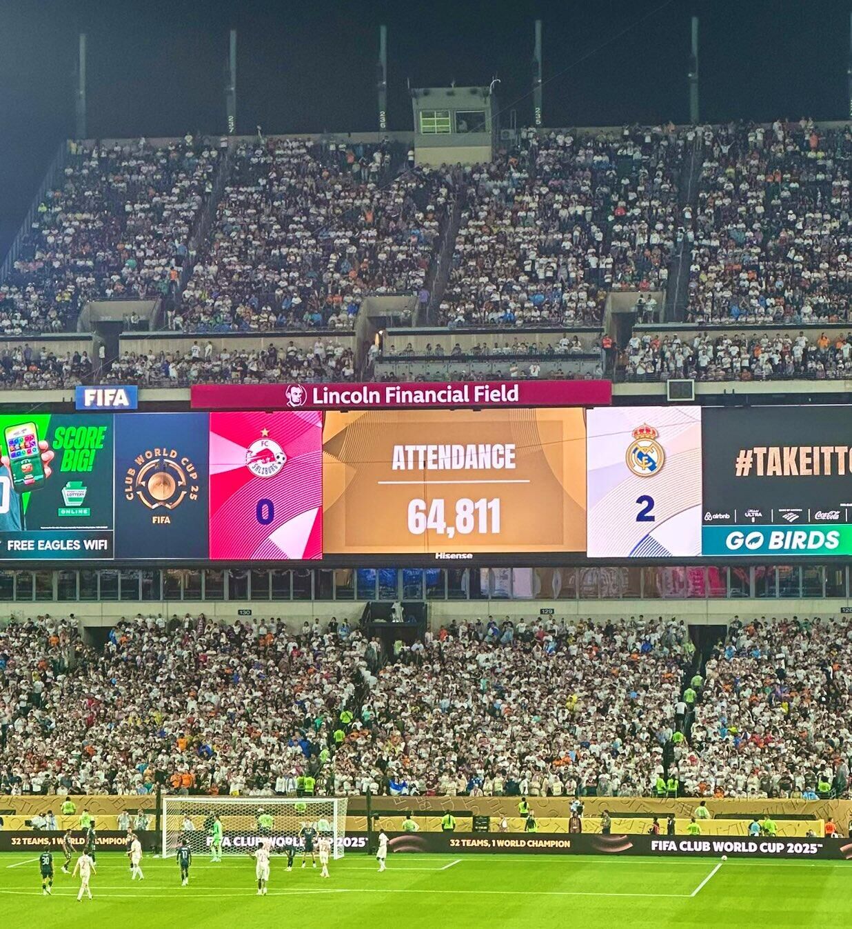 世俱杯小组赛第3轮,皇马在林肯金融运动场 3-0萨尔茨堡红牛,现场观赛人群 达到64811人,运动活动 场 容量为69000人,上座率93.93%。